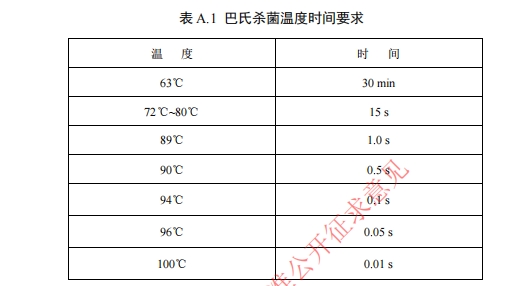 此外,明確巴氏殺菌的溫度時(shí)間要求,如溫度63—100℃,對(duì)應(yīng)的殺菌時(shí)間從30分鐘到0.01秒不等。巴氏殺菌指在有效殺滅病原性微生物的同時(shí),產(chǎn)生最低程度的化學(xué)、物理以及感官變化的加工方法。