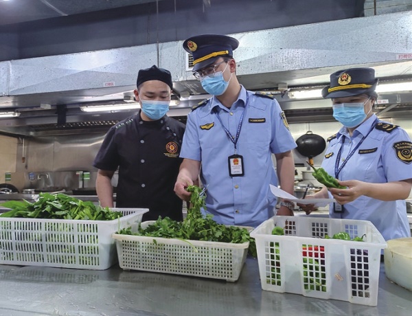 圖為檢測人員在對供餐點的蔬菜進行快檢。
