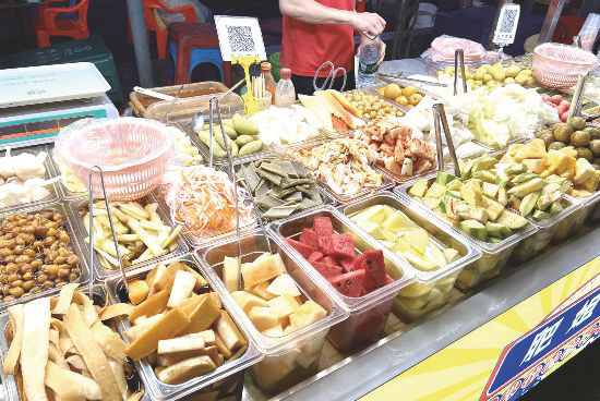 夏季的傍晚,走進(jìn)南寧平西夜市,酸嘢攤前總是圍滿了人。透明的玻璃缸中浸泡著各種水果和蔬菜,色彩斑斕,味道各異?!袄习澹瑏硪环菟釃S?!薄跋氤允裁醋约哼x。”食客拿起小籃子,挑選了李子、菠蘿、芒果、番石榴、木瓜……老板接過小籃子,配以椒鹽粉、辣椒粉、甘草粉等調(diào)料混合攪拌。一塊酸嘢入口,咸辣鮮香,酸爽開胃。