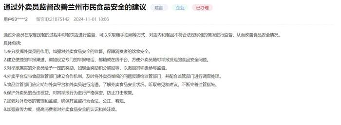 對(duì)于網(wǎng)友建議,蘭州市市場(chǎng)監(jiān)管局作出積極回應(yīng):“目前,消費(fèi)者和外賣配送人員等可通過12315電話熱線、全國(guó)12315平臺(tái)微信小程序APP及全國(guó)12315平臺(tái)網(wǎng)站等及時(shí)反映食品安全問題。我們將聯(lián)合相關(guān)外賣平臺(tái)出臺(tái)鼓勵(lì)外賣配送人員積極履行食品安全監(jiān)督職責(zé)的機(jī)制和具體措施,鼓勵(lì)其通過照片、視頻等方式留存證據(jù),加強(qiáng)對(duì)外賣食品安全的監(jiān)督,市場(chǎng)監(jiān)管部門將按照相關(guān)法律法規(guī)等要求對(duì)各類食品安全違法線索和舉報(bào)進(jìn)行核查處置。對(duì)于舉報(bào)屬實(shí)的,一方面按照《甘肅省食品安全舉報(bào)獎(jiǎng)勵(lì)辦法》相關(guān)要求給予獎(jiǎng)勵(lì);另一方面我們也將聯(lián)合相關(guān)外賣平臺(tái)進(jìn)一步研究制定具體的獎(jiǎng)勵(lì)方案,如以積分獎(jiǎng)勵(lì)等形式,激發(fā)外賣員參與監(jiān)督的熱情,形成良性監(jiān)督激勵(lì)機(jī)制?!?/p>