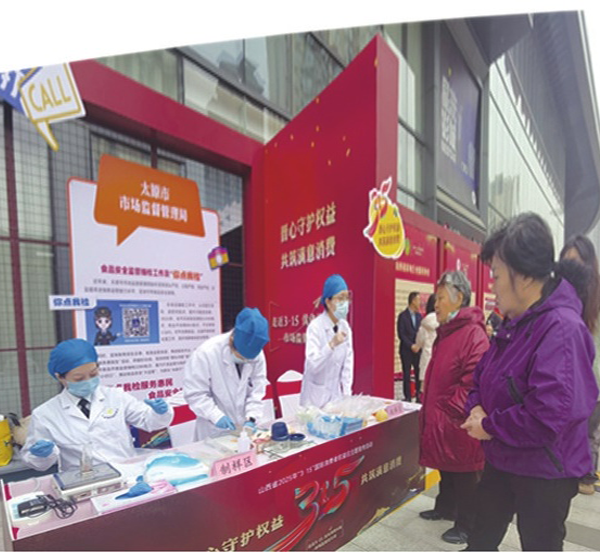 在安徽省合肥市活動(dòng)現(xiàn)場,省市兩級(jí)市場監(jiān)管部門工作人員向消費(fèi)者宣講食品安全知識(shí),推介“你點(diǎn)我檢”活動(dòng),提供“你送我檢”快速檢測服務(wù)。