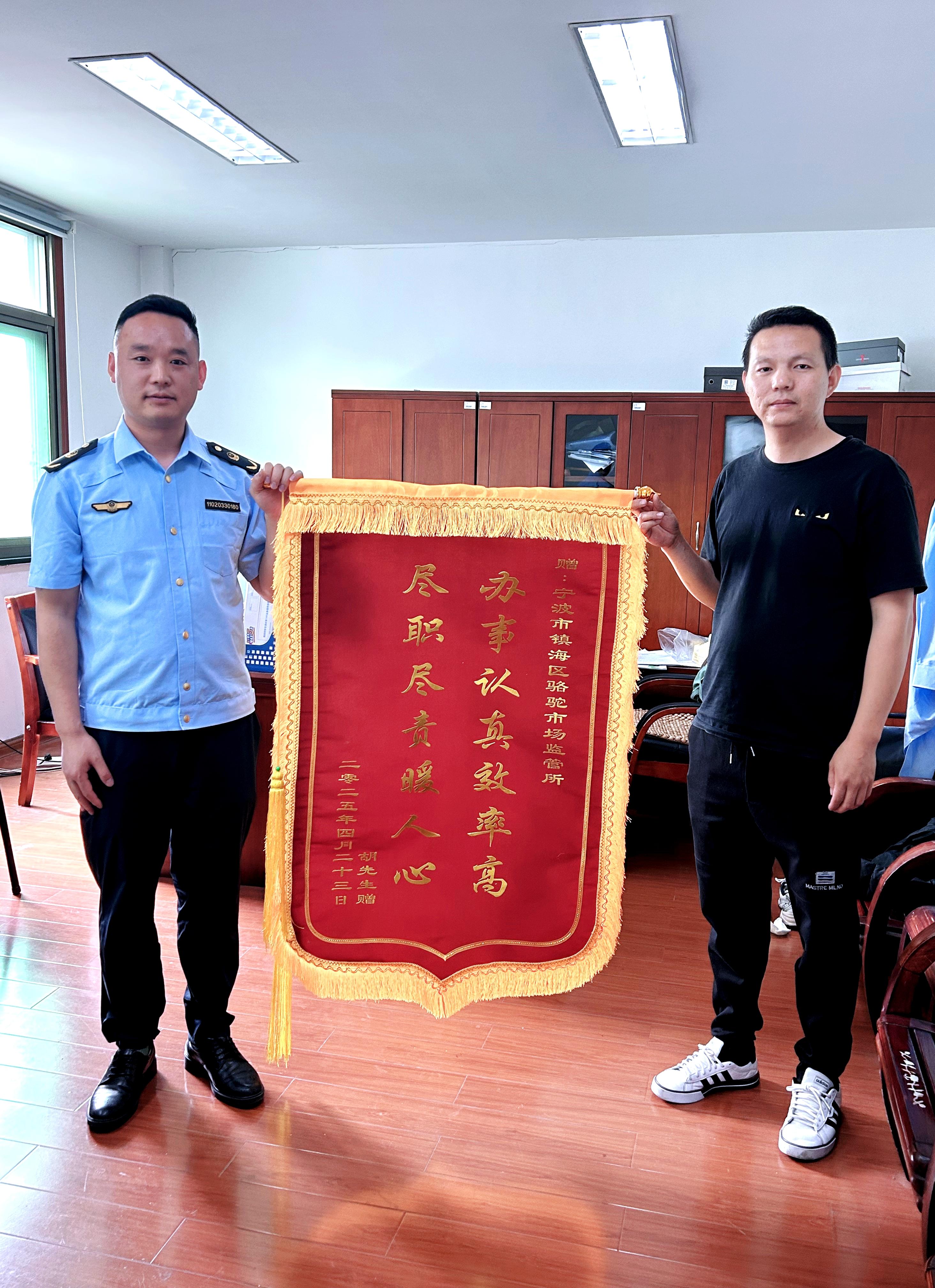 執(zhí)法不是冷冰冰的罰單,而是有溫度的服務(wù)。5月6日,老胡捧著“辦事認(rèn)真效率高 盡職盡責(zé)暖人心”的錦旗來(lái)到駱駝市場(chǎng)監(jiān)管所,和執(zhí)法人員一起拍下了一張有溫度的照片。