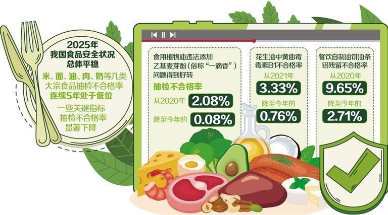 食用植物油違法添加“一滴香”問題明顯好轉(zhuǎn),粉絲粉條、餐飲自制油餅油條的鋁殘留不合格率持續(xù)下降,米面油肉奶等幾類大宗食品的不合格率連續(xù)5年處于低位……今年以來,全國食品安全監(jiān)督抽檢覆蓋了不少消費(fèi)者生活中常買、常吃的食材,食品安全治理能力和水平穩(wěn)步提升。