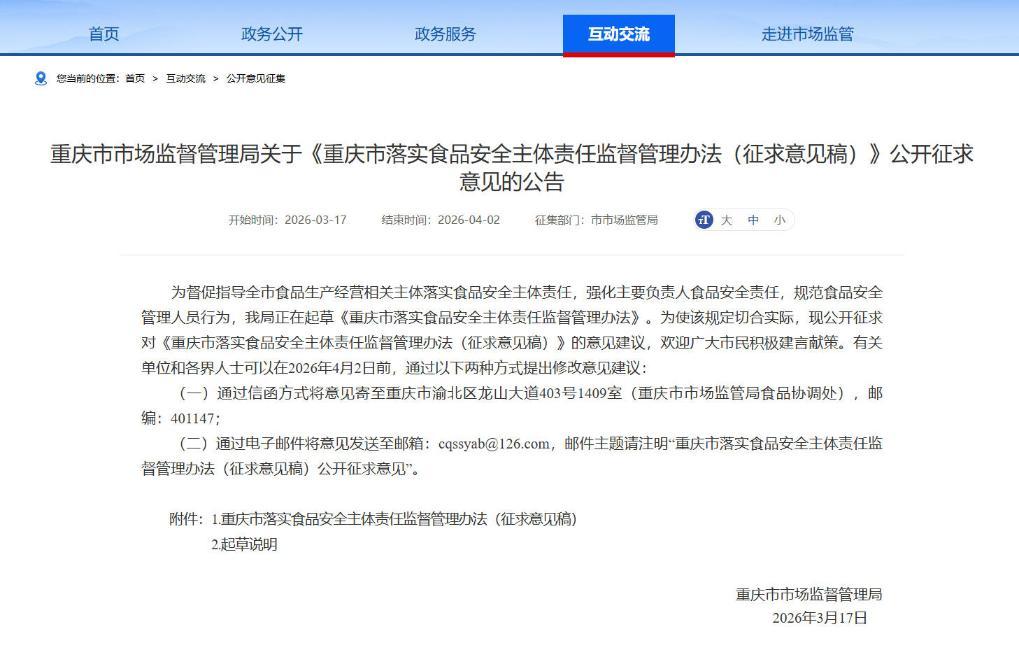 為進(jìn)一步梳理、細(xì)化、規(guī)范各類食品生產(chǎn)經(jīng)營主體的食品安全主體責(zé)任制要求,持續(xù)推動食品安全風(fēng)險防線前移,不斷提升食品安全管控質(zhì)效,近日,重慶市市場監(jiān)督管理局起草了《重慶市落實食品安全主體責(zé)任監(jiān)督管理辦法(征求意見稿)》(以下簡稱《辦法》),現(xiàn)向社會公開征求意見建議。