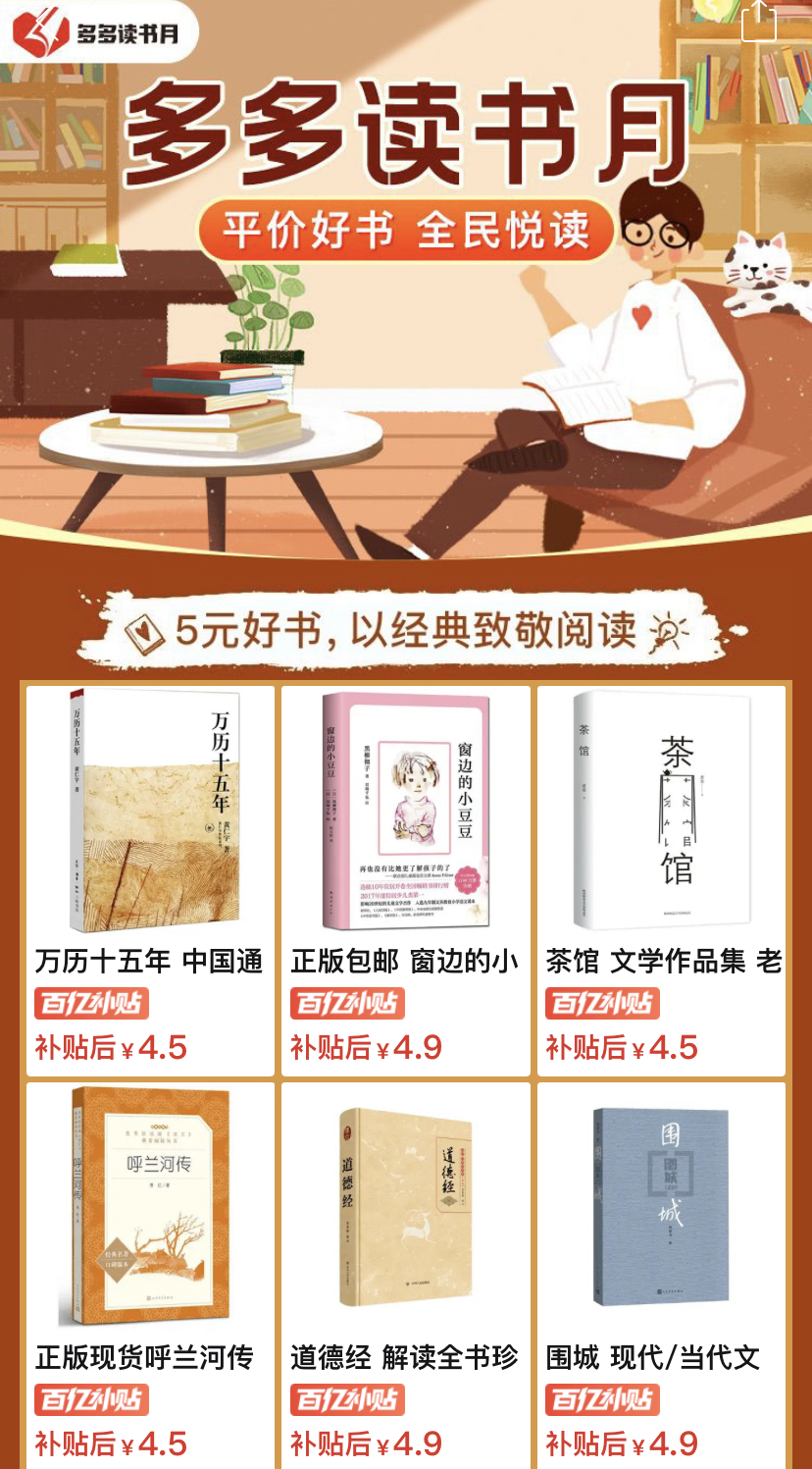 “多多讀書月”負責(zé)人表示,此次“知識普惠行動”致力于“以經(jīng)典致敬閱讀”,補貼書目由十余位資深編輯從諾貝爾文學(xué)獎、雨果獎、星云獎、茅盾文學(xué)獎、施耐庵文學(xué)獎等獲獎作品及全網(wǎng)各大閱讀榜單中精選而來,包括商務(wù)印書館、三聯(lián)書店、人民文學(xué)出版社、中信出版社、中華書局等出版的眾多經(jīng)典名作。入選圖書上千款,可享受讀書基金補貼,幫助平臺近8億用戶以全網(wǎng)最低價實現(xiàn)“悅讀”。用戶通過拼多多App百億補貼頻道或搜索“讀書月”“多多讀書月”便可從平臺輯錄的讀書清單里以優(yōu)惠價格“拼購”所喜愛的書籍。