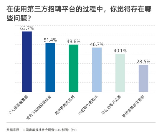 調(diào)查顯示,63.7%的受訪者覺得第三方招聘平臺(tái)存在信息泄露問題,51.4%的受訪者覺得存在發(fā)布不實(shí)招聘信息的問題。其他問題還有:簡歷被倒賣盜用(49.8%)、以招聘為名欺詐(46.7%)、平臺(tái)功能不完善(40.1%)和能檢索的職位有限(28.5%)等。