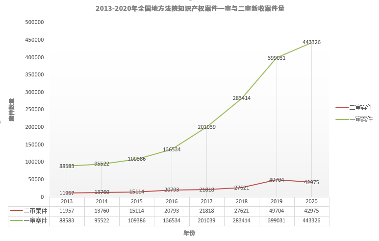 根據(jù)最高人民法院各年度知識(shí)產(chǎn)權(quán)司法保護(hù)白皮書(2013-2020年)的公開數(shù)據(jù),本報(bào)告總結(jié)了這八年的總體收案情況(表一)??傮w而言,全國(guó)地方法院知識(shí)產(chǎn)權(quán)案件一審與二審新收案件量均呈現(xiàn)逐年遞增趨勢(shì),其中一審新收案件量從2013年的88583件,增長(zhǎng)至2020年的443326件,增長(zhǎng)約4倍;二審新收案件量從2013年的11957件,增長(zhǎng)至2020年的42975件,增長(zhǎng)約2.6倍。此外,一審案件數(shù)量增幅明顯大于二審案件數(shù)量,一定程度上反映了我國(guó)一審案件審判質(zhì)效逐步提高,多數(shù)知識(shí)產(chǎn)權(quán)案件在一審階段得到解決。