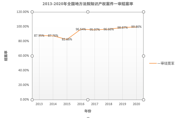 根據(jù)最高人民法院各年度知識(shí)產(chǎn)權(quán)司法保護(hù)白皮書(2013-2020年)公布的全國(guó)地方法院知識(shí)產(chǎn)權(quán)案件一審案件數(shù)和結(jié)案數(shù),計(jì)算得出全國(guó)地方法院知識(shí)產(chǎn)權(quán)案件一審結(jié)案率(表三)。