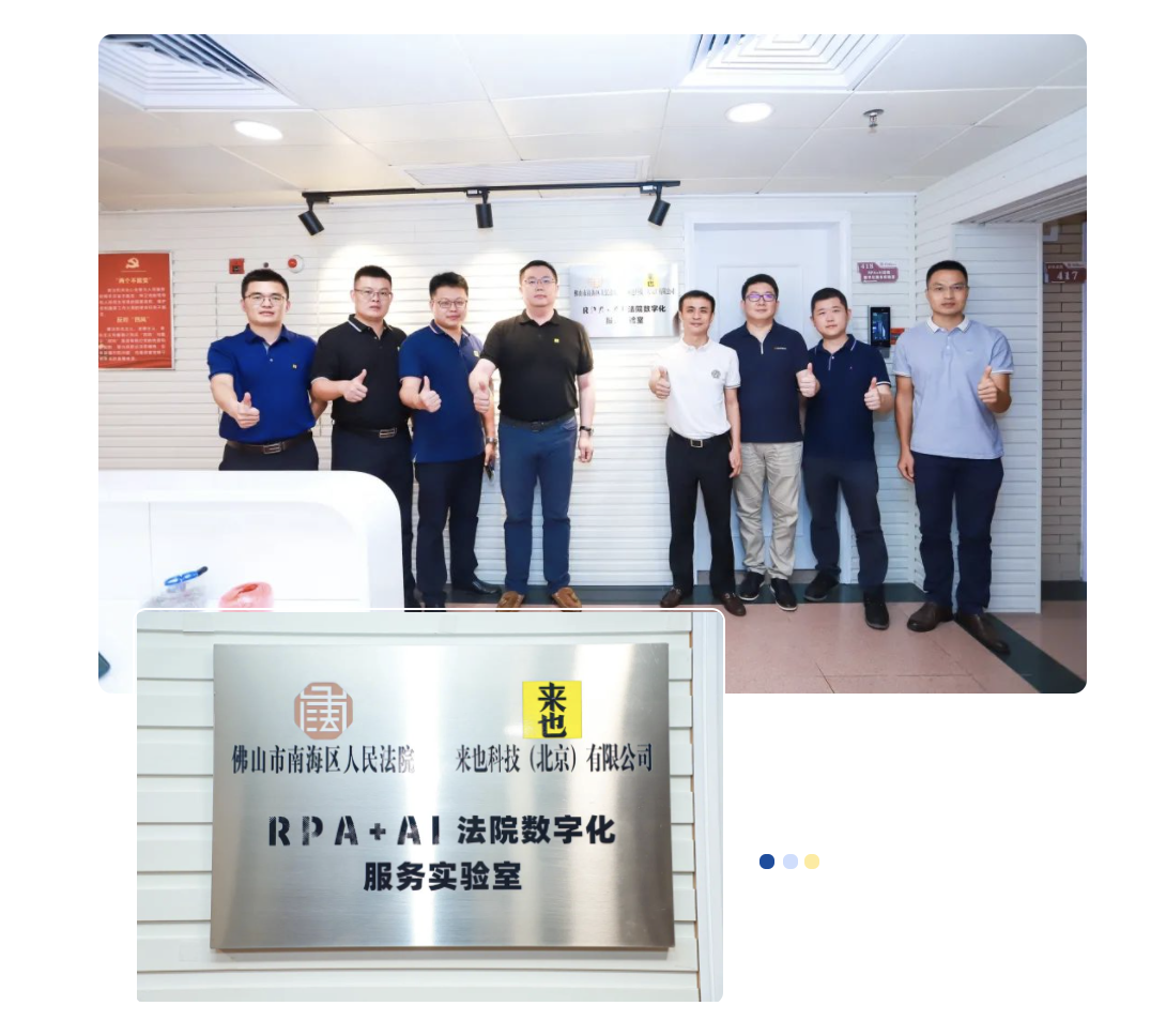 8 月 31 日,來(lái)也科技與廣東省佛山市南海區(qū)人民法院戰(zhàn)略合作簽約儀式舉行,會(huì)上佛山市南海區(qū)人民法院黨組成員、執(zhí)行局局長(zhǎng)張尚謙與來(lái)也科技合伙人兼副總裁劉敬帥簽署戰(zhàn)略合作協(xié)議,正式建立合作關(guān)系;隨后舉行揭牌儀式,宣布 RPA+AI 法院數(shù)字化服務(wù)實(shí)驗(yàn)室成立,雙方參觀了實(shí)驗(yàn)室并展開(kāi)深度探討。