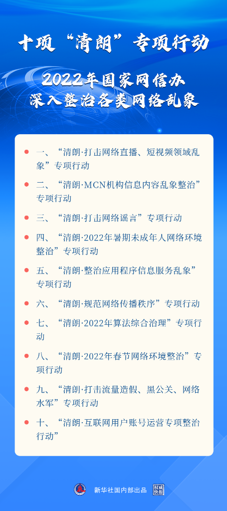 “實踐證明,開展‘清朗’系列專項行動,集中整治各類網(wǎng)絡(luò)亂象,是網(wǎng)絡(luò)生態(tài)治理的重要方式,也是維護(hù)億萬網(wǎng)民精神家園的有效手段?!眹揖W(wǎng)信辦副主任盛榮華在會上表示,2022年“清朗”系列專項行動將聚焦影響面廣、危害性大的問題開展整治,做到“三個更加突出”,即更加突出回應(yīng)網(wǎng)民關(guān)切,更加突出對癥下藥,更加突出效果導(dǎo)向。