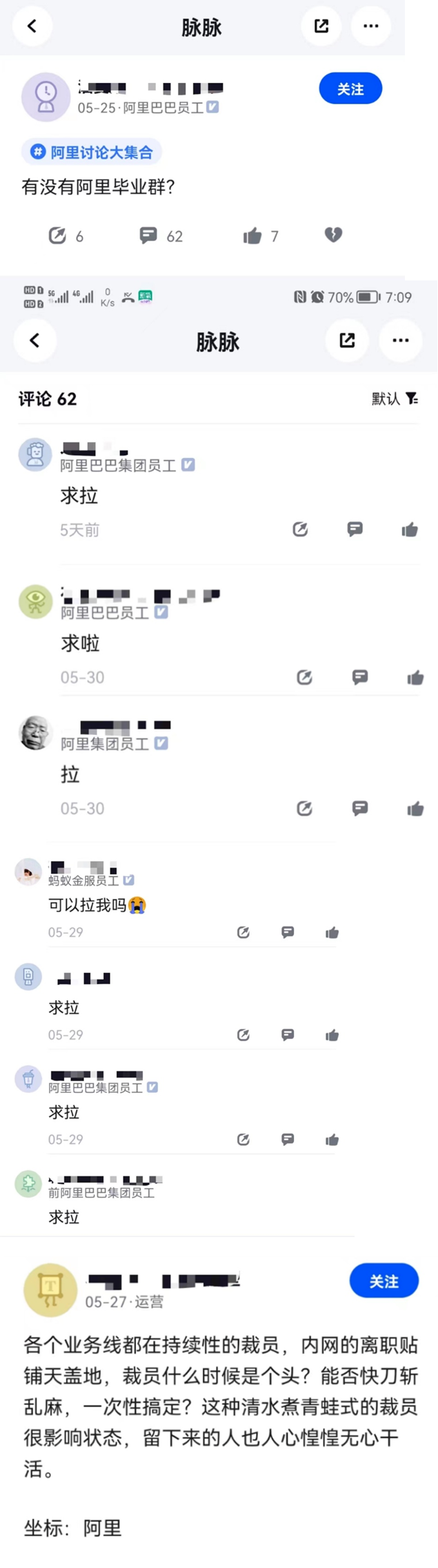 脈脈上一條“有沒有阿里畢業(yè)群”的職言下,60余條的評論基本都是“求拉”,其中,大部分評論者認證為阿里巴巴員工。還有員工發(fā)文吐槽“這種溫水煮青蛙式的裁員很影響狀態(tài),留下來的人也人心惶惶無心干活”。