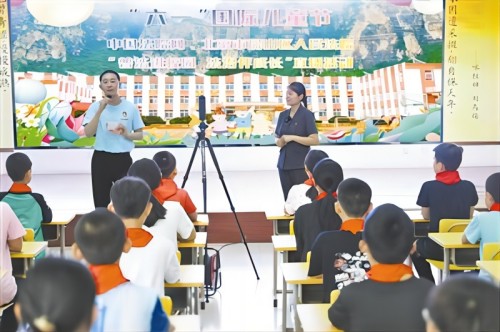 6月1日上午,中國法院網(wǎng)聯(lián)合北京市房山區(qū)人民法院走進房山區(qū)十渡中心小學,組織開展“普法進校園法治伴成長”VR直播活動。(王存輝 侯裕盛 )