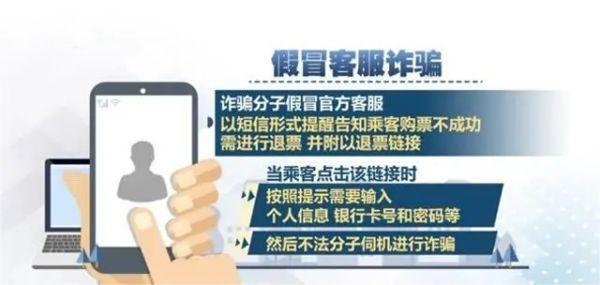 假冒客服詐騙:詐騙分子假冒官方客服以短信形式提醒告知乘客購票不成功,需進(jìn)行退票,并附以退票鏈接。當(dāng)乘客點(diǎn)擊該鏈接時(shí),按照提示需要輸入個(gè)人信息、銀行卡號(hào)和密碼等,然后不法分子伺機(jī)進(jìn)行詐騙。
