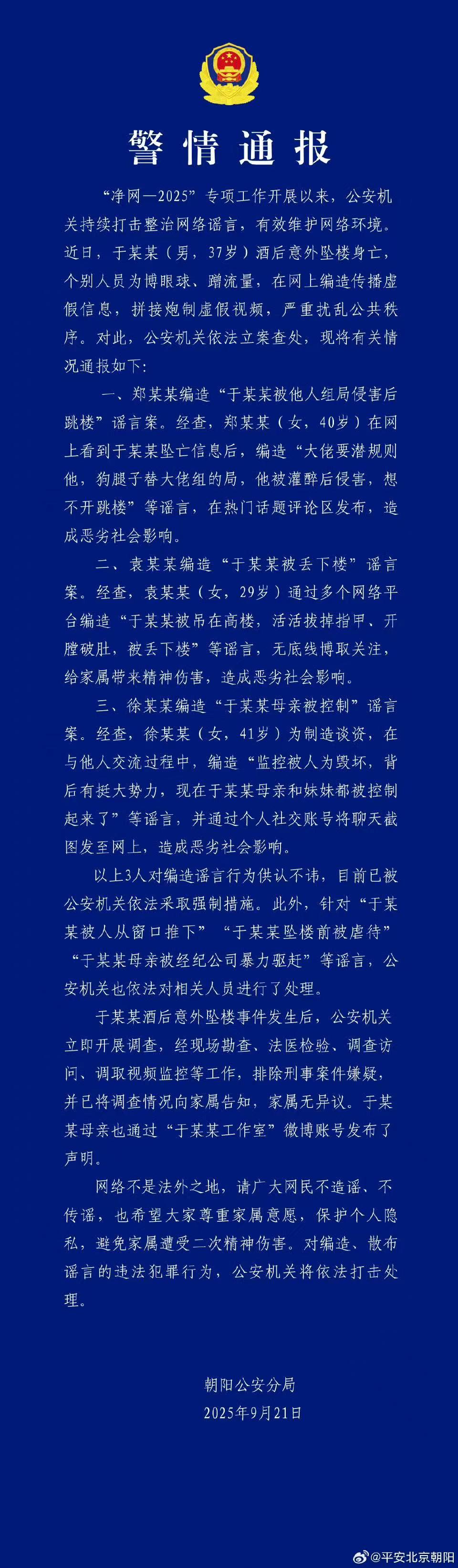 北京警方:演員于某某墜亡,三人散布謠言被采取強(qiáng)制措施