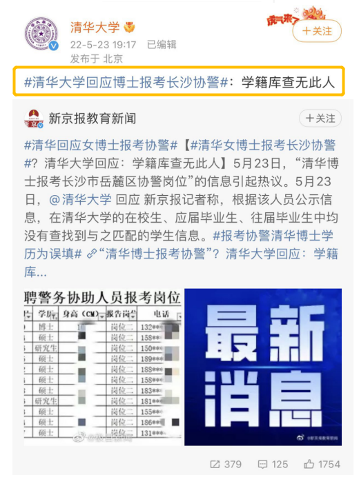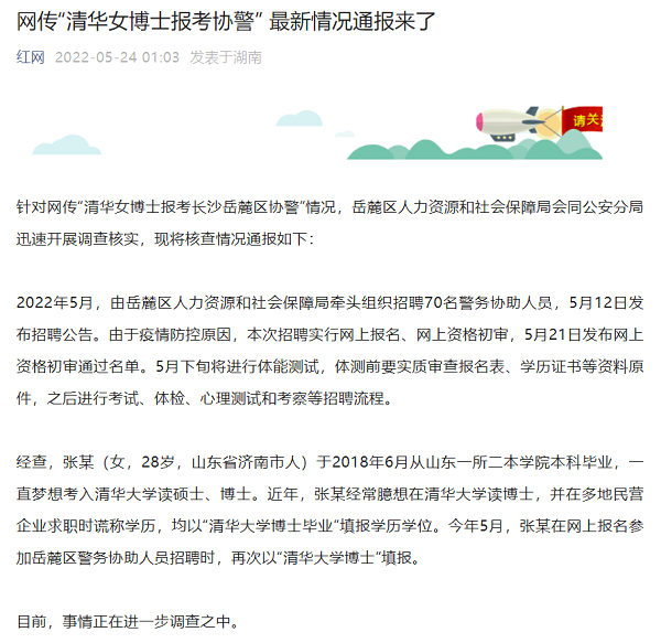 5月23日,有關(guān)“清華博士報(bào)考長沙市岳麓區(qū)協(xié)警崗位”的網(wǎng)上消息引發(fā)關(guān)注,并沖上微博熱搜。有媒體報(bào)道稱,近日網(wǎng)友爆料,有清華博士生報(bào)考長沙市岳麓區(qū)協(xié)警崗位。據(jù)岳麓區(qū)人民政府官網(wǎng)5月21日公布的《岳麓區(qū)2022年招聘警務(wù)協(xié)助人員報(bào)考審核通過名單公告》顯示,在通過“警務(wù)協(xié)助人員崗位二”審核的人員表格中,出現(xiàn)了眾多高學(xué)歷人員,其中最高學(xué)歷為一位1994年出生的張姓女博士(特長備注為“清華大學(xué)”)。