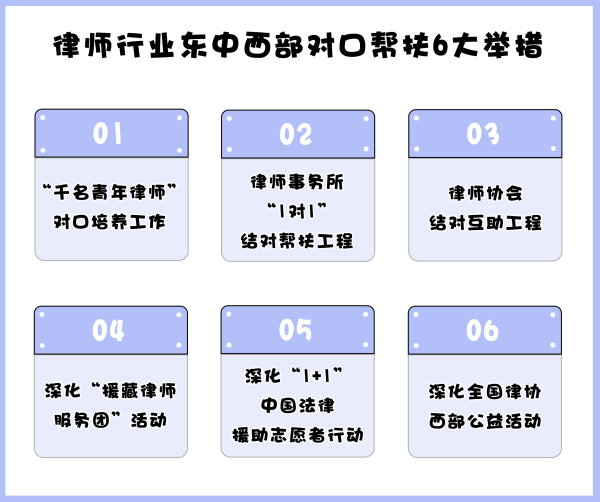 為有效推進(jìn)律師行業(yè)東中西部對口幫扶工作,《關(guān)于建立健全律師行業(yè)東中西部對口幫扶機(jī)制的方案》列舉了如下措施。