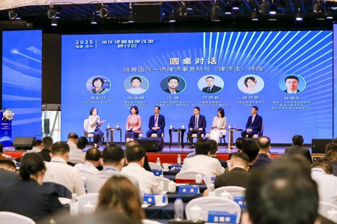 在圓桌對話環(huán)節(jié)中,盈科律師事務所中國區(qū)執(zhí)行副主任、盈科福建區(qū)主任東海霞、北京德和衡律師事務所黨委副書記、聯(lián)席主任江波、華商律師事務所執(zhí)行合伙人、涉外委主任齊夢林、上海世其律師事務所創(chuàng)始人 徐菲繁、黑龍江大學法學院副教授、黑龍江省法學會律師法學研究會常務副會長姜述弢圍繞“培育國際一流律師事務所與律師法修改”進行交流,法制日報社外聯(lián)部主任陳虹偉主持。