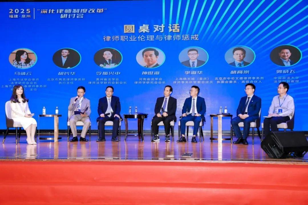 在圓桌對話環(huán)節(jié)中,北京市兩高律師事務所執(zhí)行主任胡長華、貴州省法學會律師法學研究會副會長令狐興中、河南省法學會律師學研究會會長孫世海、上海錦天城(重慶)律師事務所管委會成員李海華、北京市中倫文德律師事務所執(zhí)委會委員、高級合伙人胡高崇、中國政法大學法學院副教授郭曉飛圍繞“律師職業(yè)倫理與律師懲戒”進行交流,上海市法學會律師法學研究會會長、上海市海華永泰律師事務所黨委書記、主任馬靖云主持。