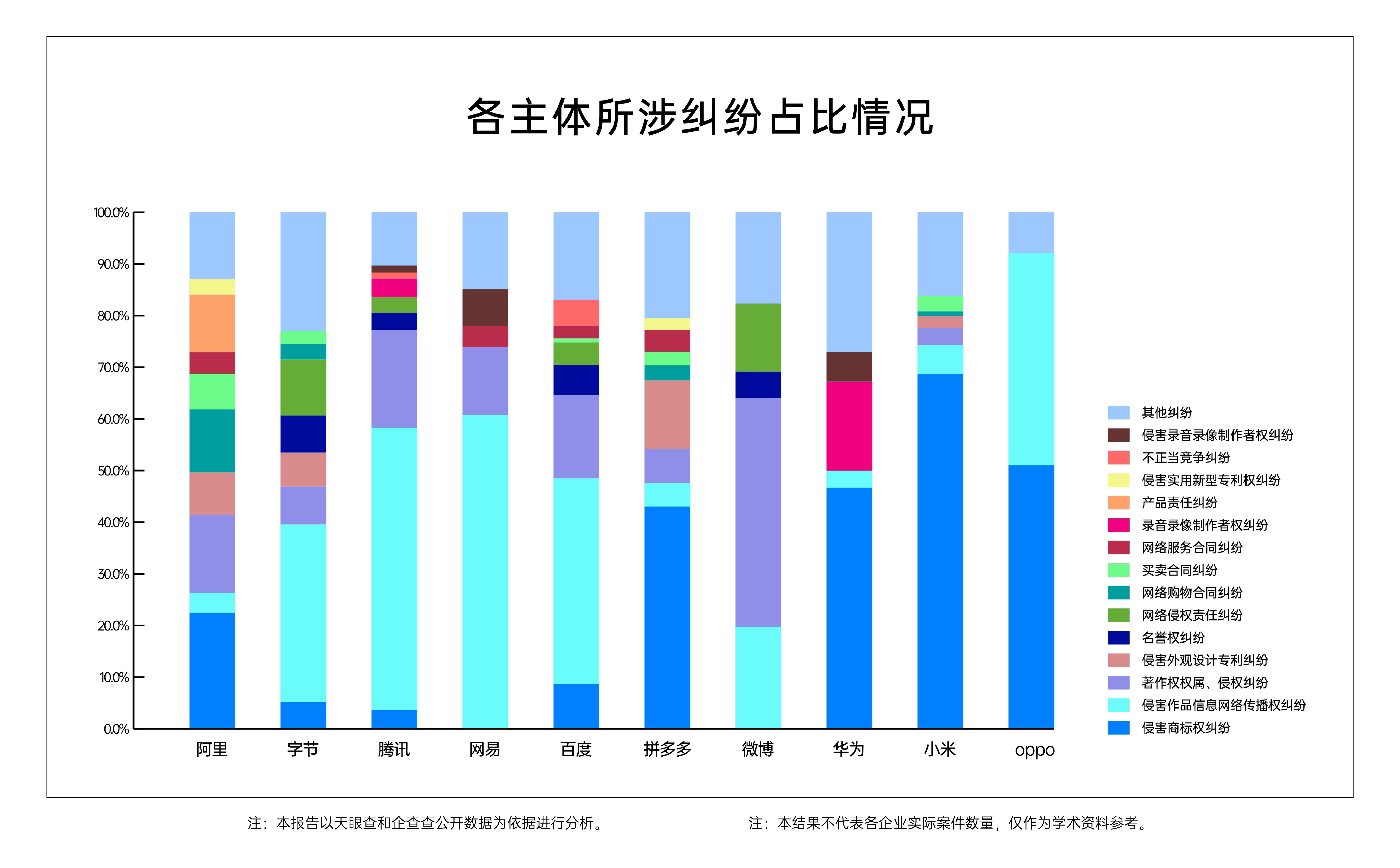 2.案件類(lèi)型高度集中:作為訴訟主體的案件集中于知識(shí)產(chǎn)權(quán)領(lǐng)域,侵害商標(biāo)權(quán)糾紛、著作權(quán)權(quán)屬侵權(quán)糾紛、侵害作品信息網(wǎng)絡(luò)傳播權(quán)糾紛這三大類(lèi)型案件在各主體的糾紛案件中占比均較高,占比相加的值均高于50%。