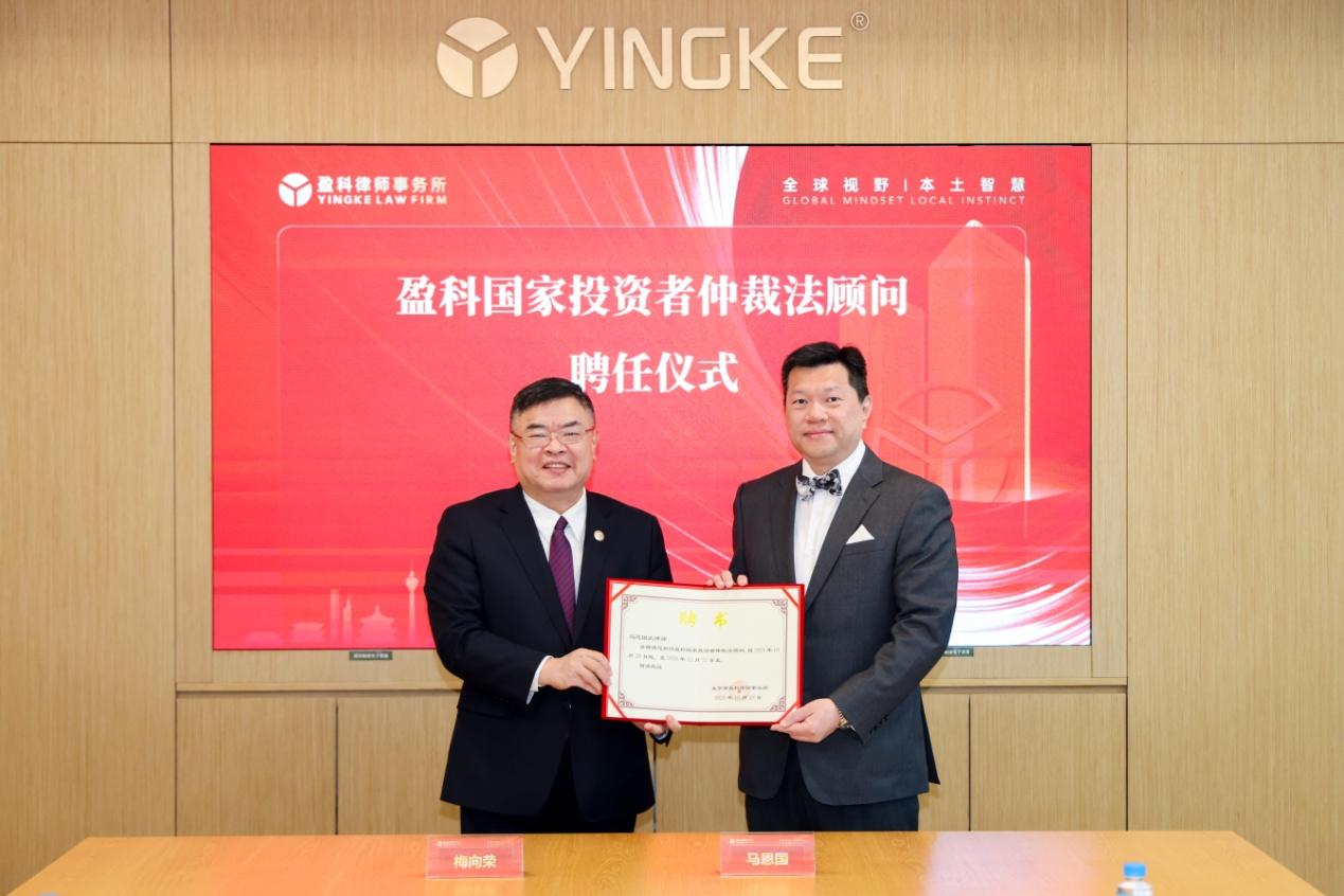 梅向榮為馬恩國頒發(fā)聘書,正式聘任其為盈科國家投資者仲裁法顧問。
