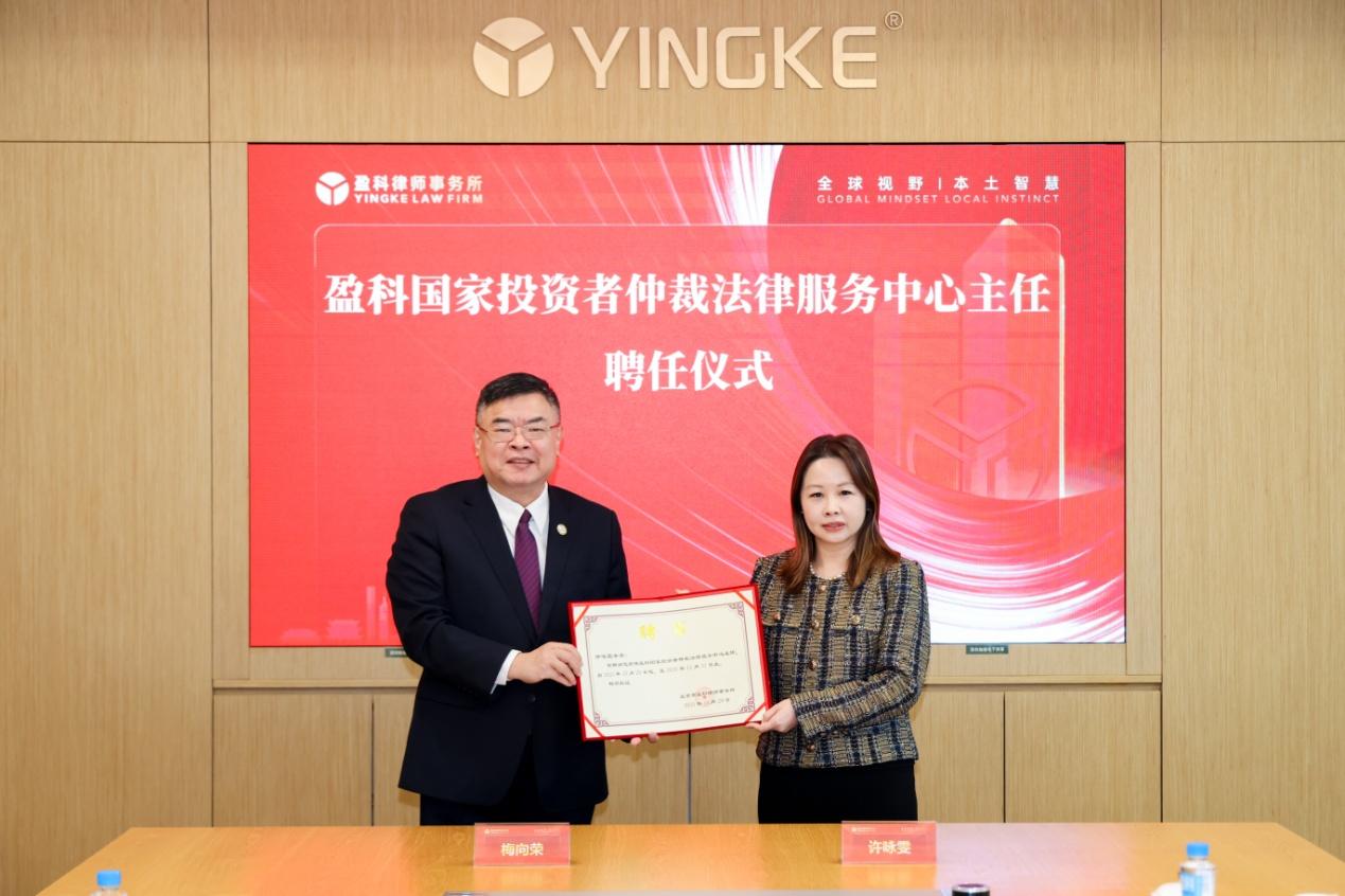 梅向榮為許詠雯頒發(fā)聘書,正式聘任其為盈科國家投資者仲裁法律服務(wù)中心主任。