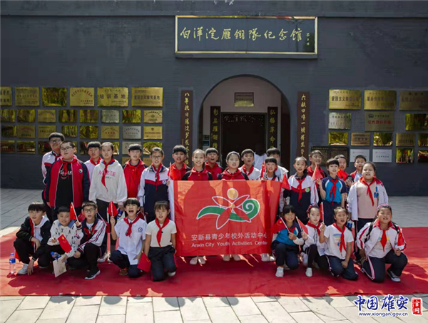 孩子們在白洋淀雁翎隊紀(jì)念館門口合影留念。中國雄安官網(wǎng)發(fā)