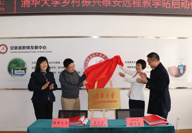 啟動儀式上,清華大學繼續(xù)教育學院黨委副書記張文雪與安新縣教育局局長王宗政代表合作雙方簽約。清華大學繼續(xù)教育學院院長劉震、黨委副書記張文雪與雄安新區(qū)公共服務(wù)局副局長夏韶華、安新縣政府副縣長郝順清共同為“清華大學鄉(xiāng)村振興雄安遠程教學站”揭牌。
