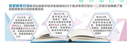 智慧教育行動是河北省數(shù)字經(jīng)濟發(fā)展規(guī)劃20個重點專項行動之一。行動計劃明確了我省智慧教育行動的發(fā)展目標:2020年,全省各級各類學校寬帶網(wǎng)絡(luò)接入率達到98%以上,優(yōu)質(zhì)在線教育資源覆蓋50%以上學校,全面啟動智慧學校、智慧課堂建設(shè)工作。到2021年,基本普及河北“教育云”服務(wù),優(yōu)質(zhì)在線教育資源覆蓋80%以上學校,智慧學校、智慧課堂建設(shè)體制機制進一步健全。到2022年,全省所有學校實現(xiàn)寬帶網(wǎng)絡(luò)全覆蓋,智慧校園建設(shè)加快推進,智慧教育基礎(chǔ)設(shè)施建設(shè)水平明顯提升。河北“教育云”服務(wù)全面普及,優(yōu)質(zhì)教育教學資源的集成推送更加高效,教育管理信息的整合應(yīng)用更加普及。師生信息化應(yīng)用水平與信息素養(yǎng)普遍提升,以自主、個性、協(xié)作、泛在為特征的新型教學模式廣泛應(yīng)用?,F(xiàn)代信息技術(shù)與教育實現(xiàn)深度融合,網(wǎng)絡(luò)化、數(shù)字化、智能化、個性化、終身化的教育體系初步形成,智慧教育總體水平躋身中西部前列,教育現(xiàn)代化和教育強省建設(shè)取得重要進展。
