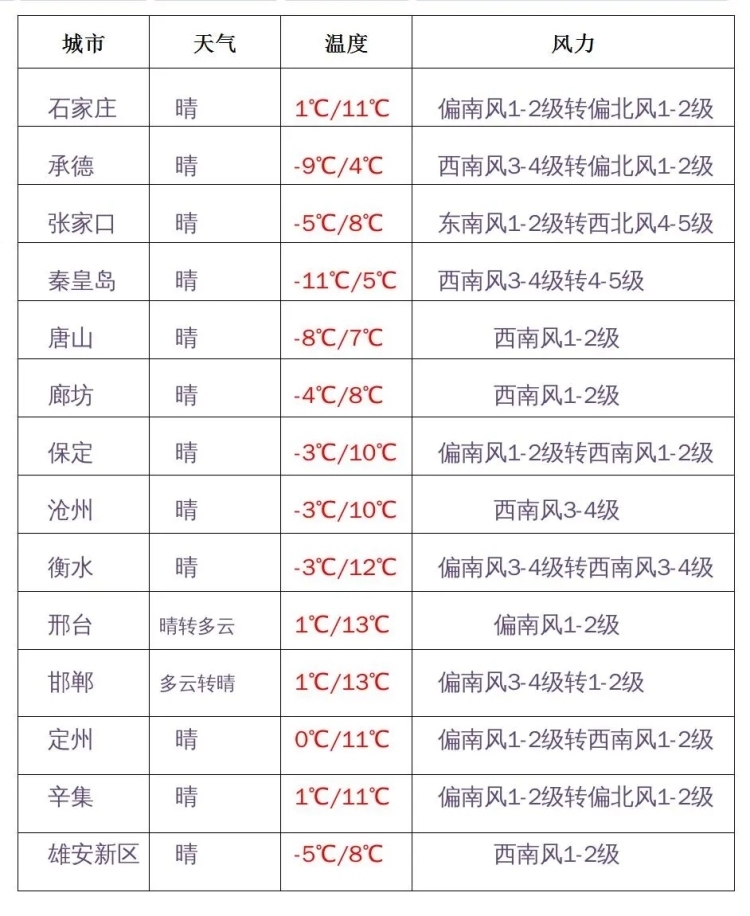 今天早晨,各地最低氣溫全部在-5℃以下,而北部地區(qū)以及滄州,還會(huì)跌破-10℃線。