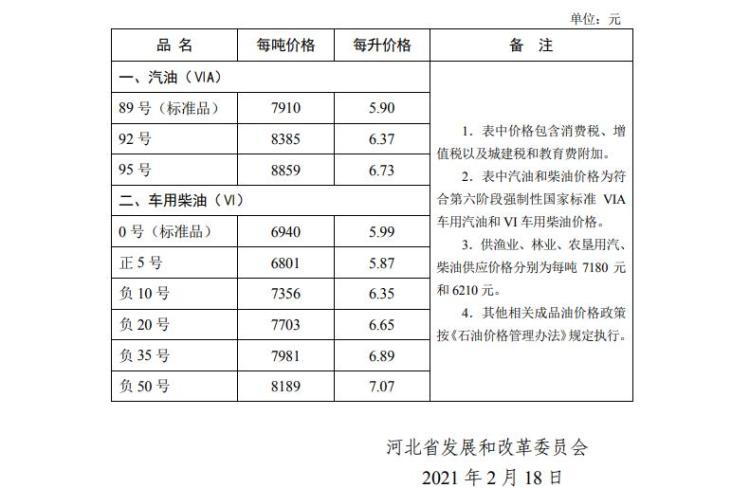 2月18日,河北省發(fā)展和改革委員會(huì)發(fā)布《關(guān)于調(diào)整我省成品油價(jià)格的公告》。根據(jù)現(xiàn)行成品油價(jià)格形成機(jī)制,自2021年2月18日24時(shí)起,河北省汽、柴油價(jià)格(標(biāo)準(zhǔn)品)每噸分別提高275元、265元,調(diào)整后的汽、柴油最高零售價(jià)格見(jiàn)下表。乙醇汽油價(jià)格按同標(biāo)號(hào)汽油(VIA)價(jià)格執(zhí)行,普通柴油價(jià)格按照同標(biāo)號(hào)車(chē)用柴油(VI)價(jià)格執(zhí)行,98號(hào)汽油價(jià)格由成品油生產(chǎn)經(jīng)營(yíng)企業(yè)根據(jù)市場(chǎng)情況自主制定具體價(jià)格。(河北日?qǐng)?bào)記者潘文靜)
