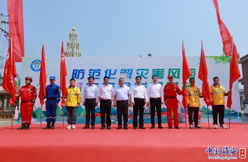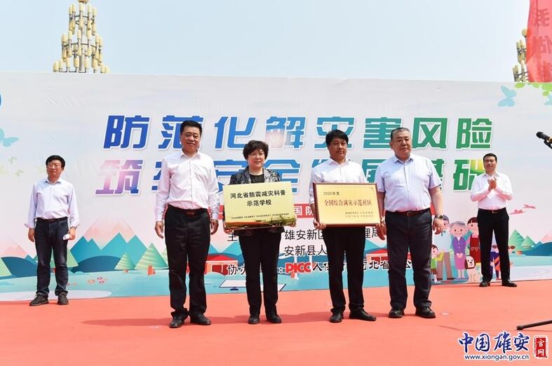 在全國(guó)防災(zāi)減災(zāi)日宣傳活動(dòng)現(xiàn)場(chǎng),戴泊生向安新小學(xué)頒發(fā)省級(jí)地震科普教育示范學(xué)校牌匾,劉樹軍向東淀頭村頒發(fā)全國(guó)綜合減災(zāi)示范社區(qū)牌匾,兩位領(lǐng)導(dǎo)共同向雄州救援隊(duì)、雄風(fēng)救援隊(duì)、藍(lán)天救援隊(duì)、美團(tuán)代表隊(duì)等新區(qū)安全宣傳志愿者隊(duì)伍代表授旗。中國(guó)人民財(cái)產(chǎn)保險(xiǎn)股份有限公司雄安分公司籌建負(fù)責(zé)人張友林為活動(dòng)致開幕詞,中國(guó)福利基金會(huì)支持雄安公益基金執(zhí)行主任、北京支持雄安產(chǎn)業(yè)發(fā)展促進(jìn)會(huì)常務(wù)副會(huì)長(zhǎng)兼秘書長(zhǎng)彌雪向雄安新區(qū)捐贈(zèng)了高空細(xì)水霧滅火消防車。