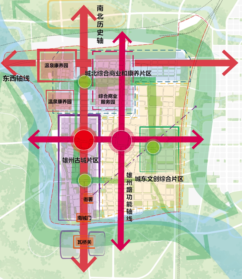 “池面綠陰通易水,樓頭青靄見狼山,漁舟掩映江南浦,使驛差池古北關(guān)”。雄縣組團(tuán)縣城片區(qū)在白溝引河、大清河、新蓋房分洪道三條水脈的拱衛(wèi)下,仿若一朵秀美荷花,緩緩綻放。規(guī)劃方案遵循其良好的生態(tài)本底與景觀特色,同時溯源雄縣延續(xù)千年的古城形制和歷史街巷格局,整體形成“一水彎環(huán)、雙軸交匯、一城兩片”的空間布局結(jié)構(gòu)。大清河依城而過,南北歷史軸和新區(qū)東西軸交匯于縣城,雄州路和文昌大街交匯形成內(nèi)部功能發(fā)展軸,依托城、關(guān)、河等歷史要素,恢復(fù)雄州古城歷史格局,發(fā)展城東文創(chuàng)綜合片區(qū)、城北綜合商業(yè)和康養(yǎng)片區(qū)。