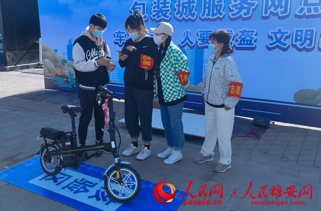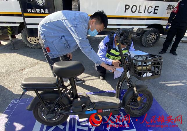 容東片區(qū)服務(wù)點的民警正在查驗群眾的電動自行車。人民網(wǎng) 劉師豪攝