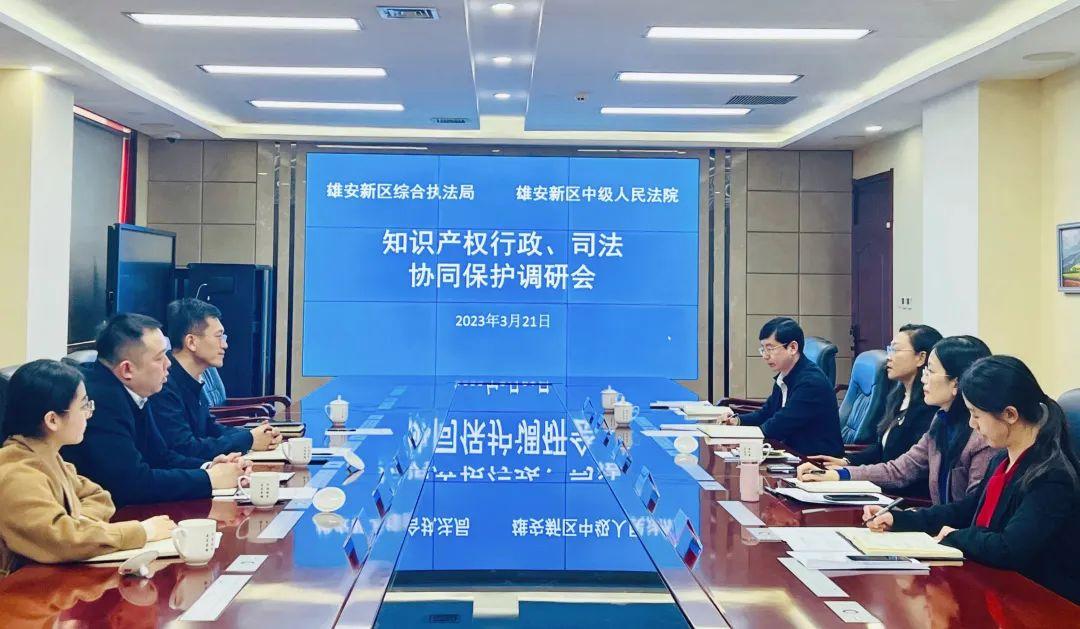 為落實(shí)河北省市場監(jiān)督管理局、河北省高級人民法院聯(lián)合印發(fā)的《關(guān)于落實(shí)強(qiáng)化知識產(chǎn)權(quán)協(xié)同保護(hù)意見的通知》要求,積極營造雄安新區(qū)穩(wěn)定公開透明、可預(yù)期的法治化營商環(huán)境,3月21日、22日,雄安新區(qū)中級人民法院與雄安新區(qū)綜合執(zhí)法局副局長李聰一行、中國(河北)知識產(chǎn)權(quán)保護(hù)中心張陽主任一行就知識產(chǎn)權(quán)司法行政協(xié)同保護(hù)開展了調(diào)研座談,旨在強(qiáng)化雄安新區(qū)知識產(chǎn)權(quán)司法機(jī)關(guān)與行政保護(hù)部門的協(xié)作配合機(jī)制,提升協(xié)同保護(hù)力度,為優(yōu)化雄安新區(qū)市場經(jīng)濟(jì)環(huán)境貢獻(xiàn)知識產(chǎn)權(quán)智慧。