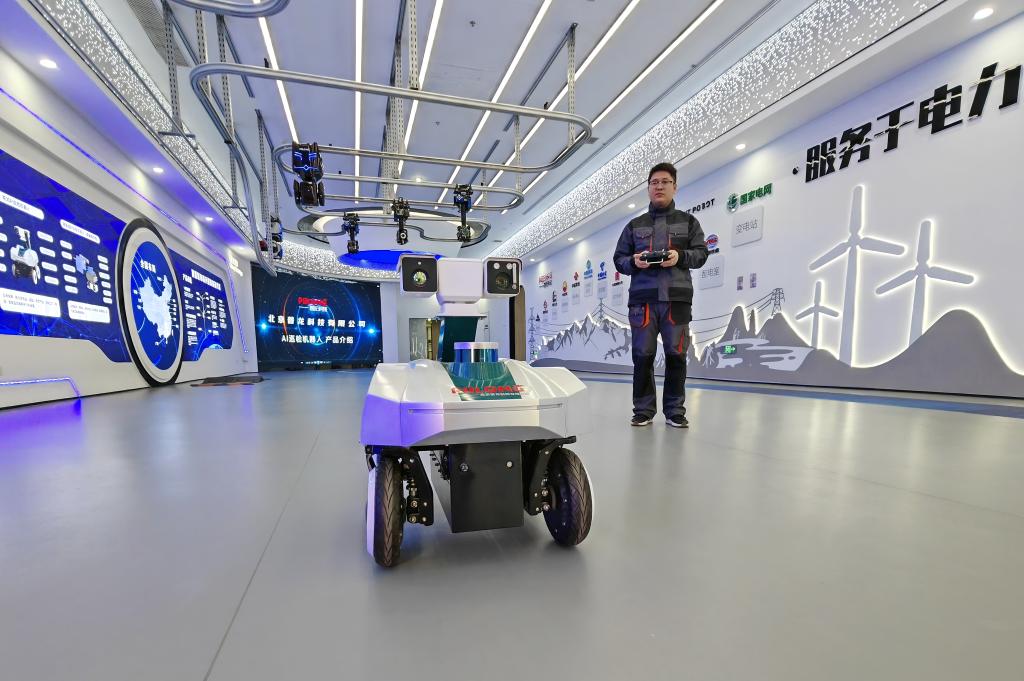3月28日,在雄安科創(chuàng)中心中試基地,普龍科技有限公司工作人員在展示巡檢機器人。新華社記者楊世堯 攝