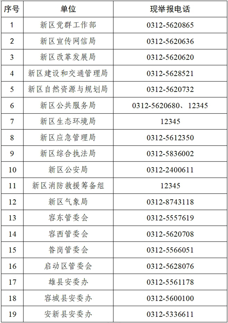 為認真貫徹落實《中華人民共和國安全生產(chǎn)法》《河北省安全生產(chǎn)條例》和《河北省安全生產(chǎn)舉報和獎勵辦法(試行)》等法律法規(guī)和文件規(guī)定,鼓勵企業(yè)內(nèi)部員工和廣大群眾舉報安全生產(chǎn)事故隱患和非法違法行為,進一步加強安全生產(chǎn)領(lǐng)域社會監(jiān)督,及時治理和消除各類安全隱患,現(xiàn)將雄安新區(qū)各單位的安全生產(chǎn)舉報電話公示如下: