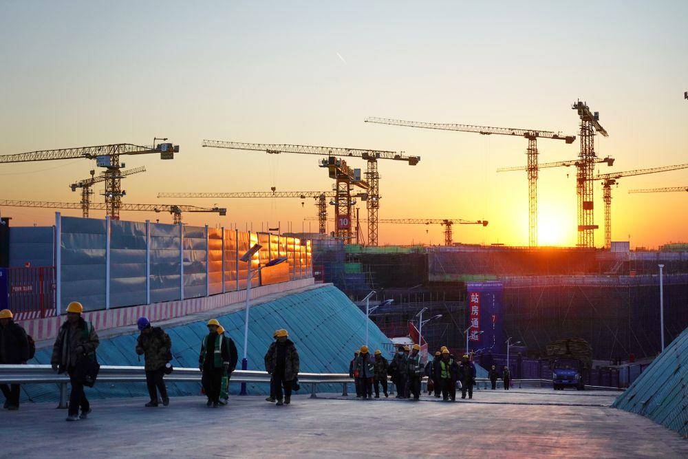 落日余暉下的雄安新區(qū)國(guó)貿(mào)片區(qū)建設(shè)現(xiàn)場(chǎng)(2025年1月15日攝)。新華社記者 牟宇 攝