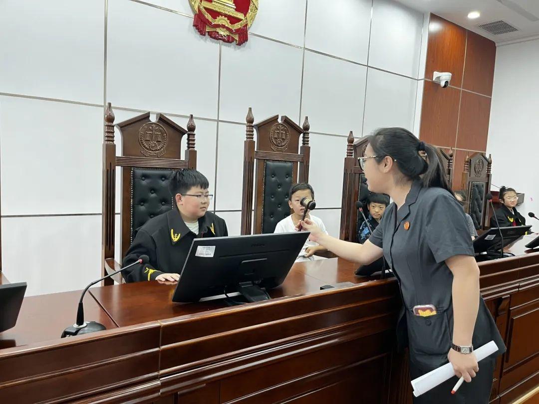 審判庭是此次參觀的“重頭戲”。推開審判庭厚重的大門,審判席、原告席、被告席整齊排列,莊嚴(yán)的氛圍讓孩子們瞬間安靜下來,在工作人員的邀請下,孩子們輪流坐上審判席,感受法袍的重量與審判席的莊嚴(yán),他們輕輕敲擊法槌,體驗“小法官”的感覺。“敲法槌時要嚴(yán)肅,因為這代表著公正裁判”工作人員為其科普法槌的意義,孩子們似懂非懂地點頭,小臉上寫滿了認(rèn)真。