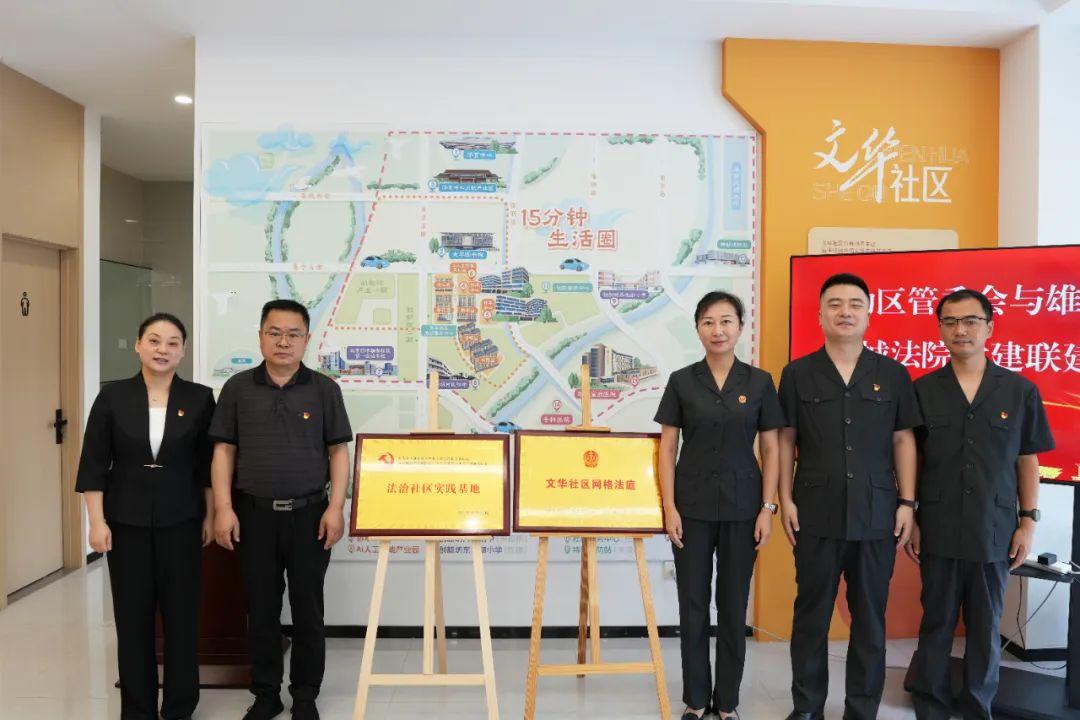 為促推基層治理法治化水平“上臺(tái)階”,8月19日,河北雄安新區(qū)中級(jí)人民法院、容城縣人民法院與雄安新區(qū)啟動(dòng)區(qū)管理委員會(huì)在文華社區(qū)開(kāi)展黨建聯(lián)建活動(dòng)。雄安新區(qū)社會(huì)工作部副部長(zhǎng)張春雷,雄安中院黨組副書記、副院長(zhǎng)李靜靜共同為“法治社區(qū)實(shí)踐基地”和“文華社區(qū)網(wǎng)格法庭”揭牌。啟動(dòng)區(qū)管委會(huì)黨組成員、副主任黃媛媛,容城法院黨組成員、副院長(zhǎng)郭凱以及黨員干警、社區(qū)群眾代表30余人參加活動(dòng)。
