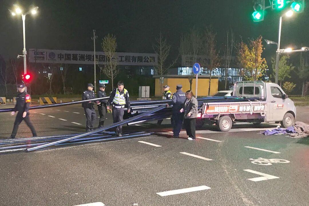 吉海祥帶領(lǐng)執(zhí)勤隊員迅速行動,一組在來車方向擺放警示標識,引導車輛緩慢繞行;一組幫助搬抬金屬管材,合力將其逐一裝回車上。經(jīng)過近20分鐘的緊張忙碌,所有散落管材均被重新裝載上車。