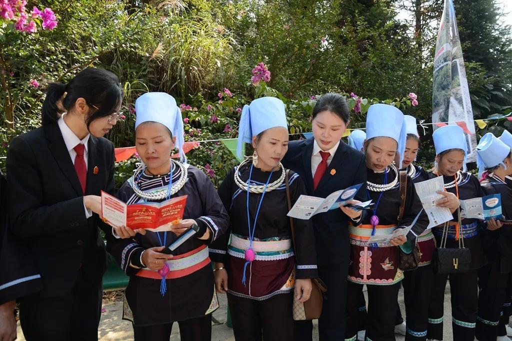近日,貴州省黔東南州榕江縣人民法院組織干警來到水尾水族鄉(xiāng)開展普法宣傳活動(dòng),為當(dāng)?shù)馗髯迦罕娝蜕戏ㄖ巍按蠖Y包”,共同慶祝水尾鄉(xiāng)建鄉(xiāng)四十周年。