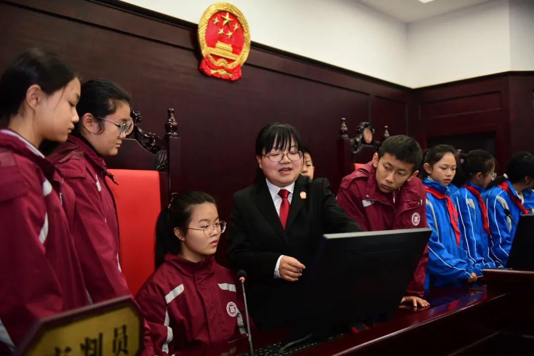 在貴州省高級人民法院高山流水銅浮雕前,大家認真聽取講解員介紹,了解審判文化、法治文化?!按蠹抑烂袷聦徟蟹ㄍズ托淌聦徟蟹ㄍサ膮^(qū)別嗎?”走進審判法庭,大家興致勃勃地觀摩了解智慧庭審系統(tǒng)功能、審判法庭設置等,湊到話筒前,直觀感受智能語音識別等智能輔助功能的便捷高效。