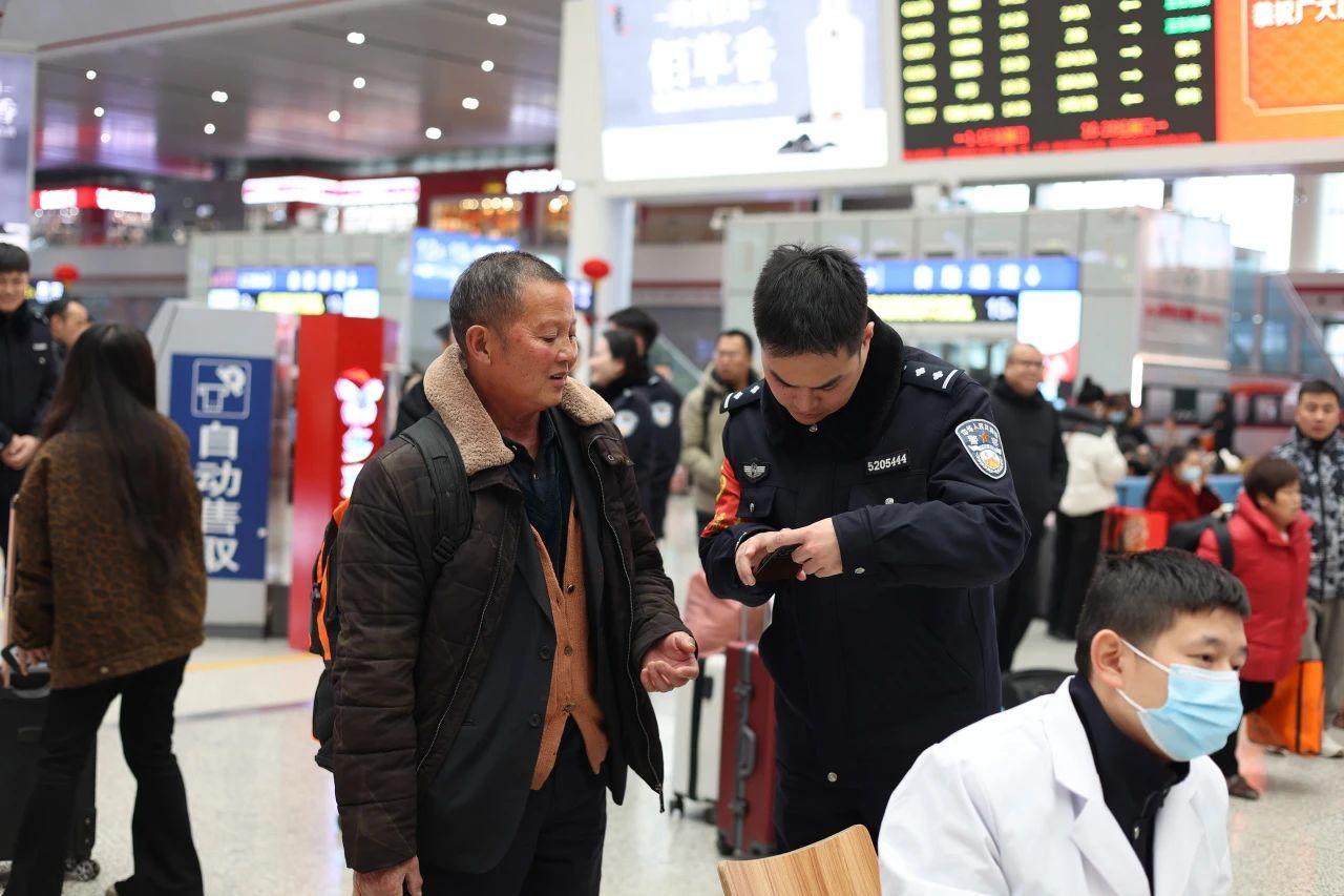 “注意腳下,請往這邊走?!薄澳?,您的檢票口在前面右轉(zhuǎn)?!薄拔襾韼湍嵝欣畎桑 痹谫F陽北站候車室內(nèi),戴著紅袖套的志愿者民警們?yōu)槁每吞峁┳稍冎敢?、搬運(yùn)行李、電子取票等溫馨服務(wù),用這一抹紅色點(diǎn)綴春運(yùn),用實(shí)際行動溫暖寒冬。
