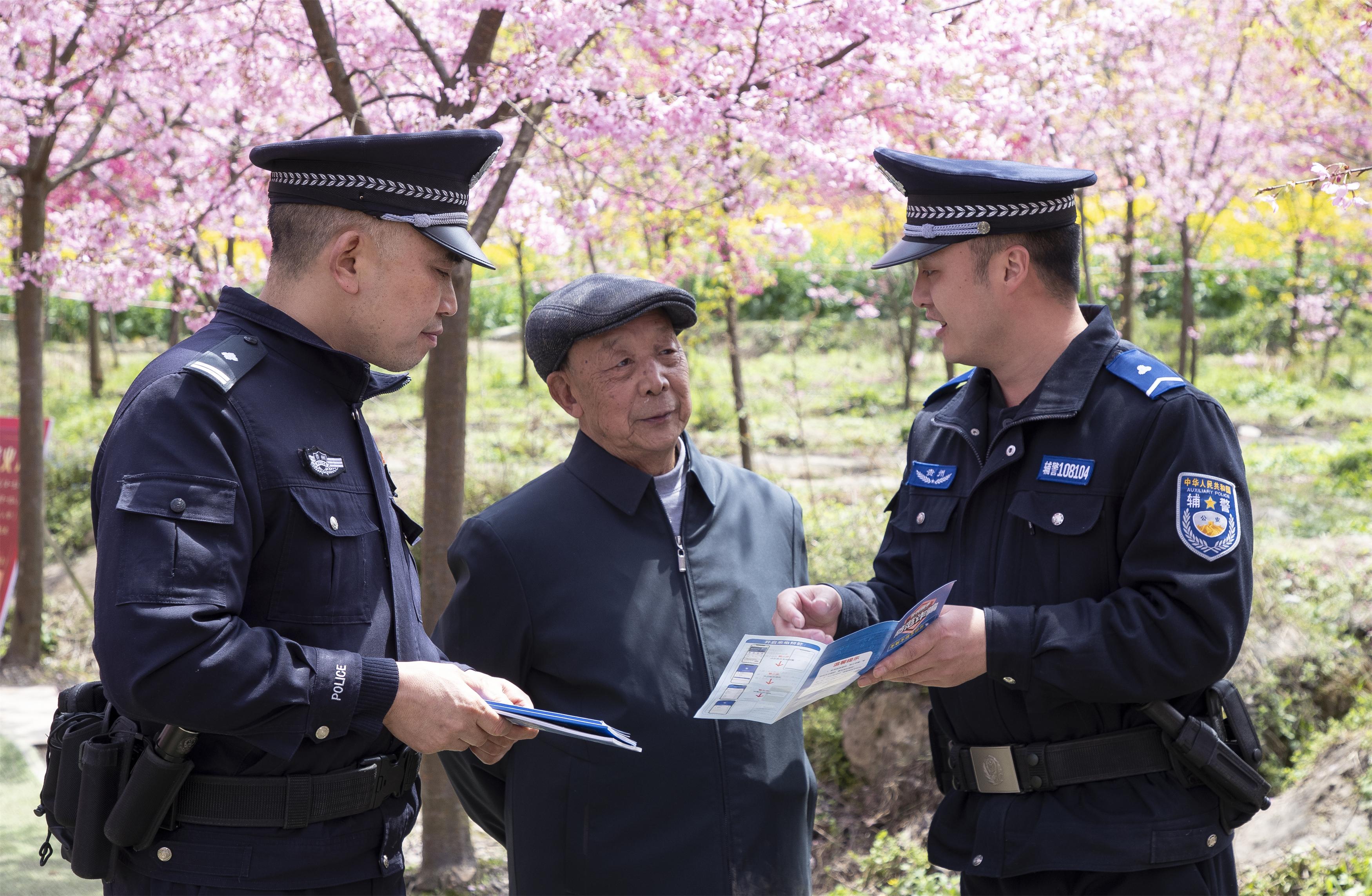 櫻花樹下,民警積極主動,發(fā)放資料、講解案例、解答疑問,與前來賞花的游客“嘮安全、講反詐、話平安”,讓大家在賞花游玩的同時增強了自身安全防范意識。