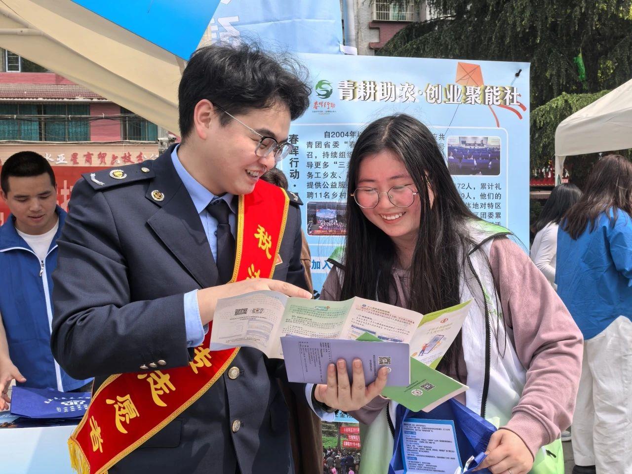 在活動(dòng)現(xiàn)場,稅法宣傳志愿者穿梭于“青聽心聲·鄰里會(huì)客廳”“青護(hù)家園·環(huán)保先鋒營”“青耕助農(nóng)·創(chuàng)業(yè)聚能社”等展示區(qū),用通俗易懂的語言為“擺攤者”“趕集者”講解個(gè)人所得稅專項(xiàng)附加扣除、重點(diǎn)群體創(chuàng)業(yè)就業(yè)稅收優(yōu)惠、社保費(fèi)繳納流程等與群眾生活、經(jīng)營息息相關(guān)的熱點(diǎn)稅收知識。此次活動(dòng)還設(shè)置了稅法咨詢臺(tái),為前來咨詢的商戶、青年提供“一對一”答疑服務(wù),并發(fā)放印有國家稅務(wù)總局微信公眾號二維碼的宣傳折頁,方便青年群體掃碼獲取更多稅收知識。