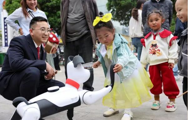 活動現(xiàn)場,一位特殊的“普法宣傳員”——智能普法機(jī)器狗“小白”閃亮登場,瞬間成為全場焦點。這只靈活可愛的機(jī)器狗不僅能自如行走、做出俏皮動作,更能通過內(nèi)置的普法知識庫,用孩子們喜聞樂見的語言和方式,生動講解《中華人民共和國未成年人保護(hù)法》中的“家庭保護(hù)”“學(xué)校保護(hù)”“社會保護(hù)”以及民法典中關(guān)于未成年人權(quán)益保障的相關(guān)條款。它機(jī)智的回答、萌萌的互動,引得小朋友們紛紛圍觀、踴躍提問,在歡聲笑語中將法治的種子悄然播撒心田。