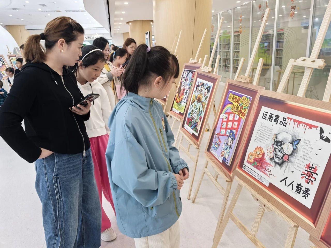 圖書館內(nèi),百余幅來自觀山湖區(qū)各中小學(xué)生的優(yōu)秀禁毒主題書畫作品精彩亮相,稚嫩的畫筆與真誠的色彩勾勒出孩子們對無毒未來的堅定向往,向社會傳遞純凈而有力的禁毒宣言。