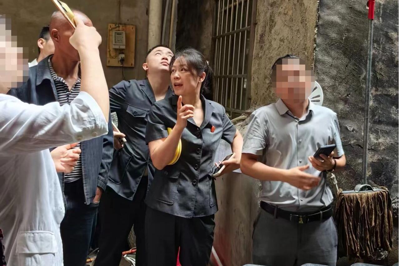 圖為法官實(shí)地查看雨棚情況。