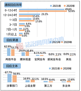 從回應(yīng)渠道來看,官方所依托的發(fā)聲渠道更為集中,有超過六成的輿情事件是借助兩微平臺(tái)做出回應(yīng),占比較2020年進(jìn)一步提升;依靠媒體報(bào)道進(jìn)行回應(yīng)的比重為29%,較上一年下降了近7個(gè)百分點(diǎn);以官網(wǎng)發(fā)布作為回應(yīng)渠道的事件略微增多,占比8.1%。目前來看,大多數(shù)回應(yīng)主體之所以選擇自有渠道主動(dòng)做出回應(yīng)而非采取第三方轉(zhuǎn)達(dá)的方式,是因?yàn)橐环矫婕械膬?nèi)容公開明顯提升了回應(yīng)的權(quán)威性,避免被多方轉(zhuǎn)述造成信息誤差從而導(dǎo)致內(nèi)容被公眾曲解的風(fēng)險(xiǎn),另一方面也可以通過社交平臺(tái)直面公眾質(zhì)疑,與輿論達(dá)成直接有效的溝通,對(duì)接網(wǎng)民“輿論監(jiān)督”的參與期待,以便更好化解輿論爭(zhēng)議。