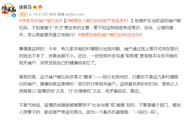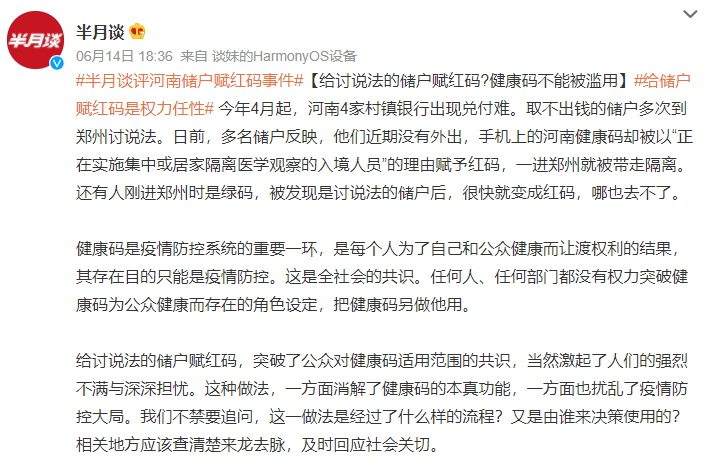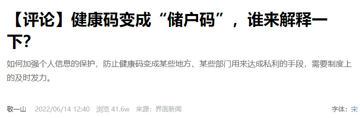 目前,不少網(wǎng)民猜測(cè)河南利用健康碼阻止儲(chǔ)戶維權(quán),并對(duì)健康碼能被用于防疫之外感到擔(dān)憂。值得注意的是,早在2021年1月,國(guó)務(wù)院聯(lián)防聯(lián)控機(jī)制綜合組印發(fā)《新冠肺炎疫情防控健康碼管理與服務(wù)暫行辦法》,強(qiáng)調(diào)各地要嚴(yán)格健康碼功能定位,不得擴(kuò)大應(yīng)用范圍,切實(shí)防止“碼上加碼”。河南給儲(chǔ)戶賦“紅碼”被輿論廣泛質(zhì)疑違反上述規(guī)定,相關(guān)輿情仍在持續(xù)發(fā)酵。截至6月17日12時(shí),相關(guān)微博話題閱讀量累計(jì)超21億。